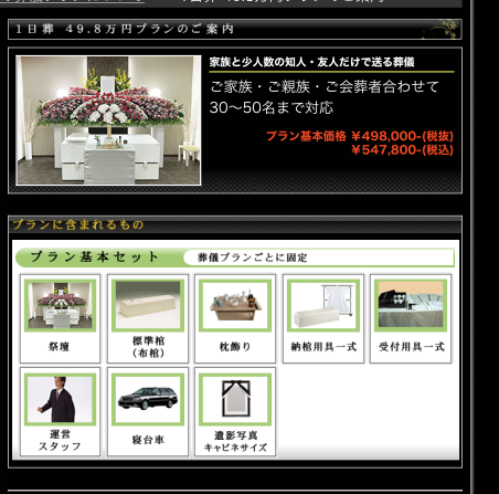 プラン1(1日葬) (¥498.000税別・¥547.800税込)~ (当社推奨) |